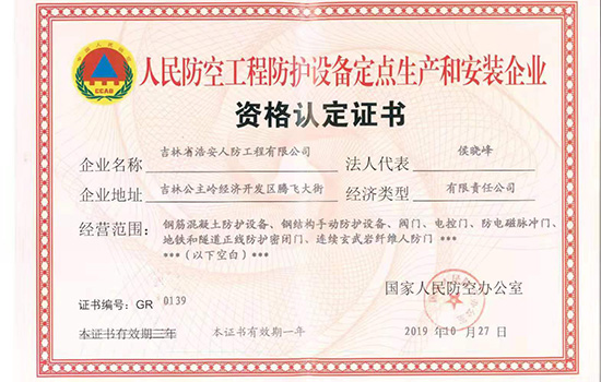 吉林省浩安人防工程有限公司是經國家人民防空辦公室批準成立的人防工程防護設備定點生產廠,2019年認定為國家級高新技術企業。本廠擁有現代化的廠房及先進的生產設備,集生產制造、質量控制、銷售服務為一體的區域性行業廠。公司座落在吉林省公主嶺經濟開發區,占地面積達10000平方米,辦公樓1200平方米,廠房建筑面積達6000平方米以上,注冊資金1000萬元,企業的技術力量雄厚,其中防護工程師,高級工程師及中高級專業技術人員占30%。青海分公司2018年10月15日成立,于當年11月26日通過 青海人民防空辦公室備案公示。 本廠經營的主要產品:連續玄武巖纖維新型人防防護門、鋼結構人防防護門、鋼筋混凝土人防防護門以及各種型號的通風設備和防化設備。本廠生產設備齊全,擁有雄厚的生產能力和技術水平,并嚴格按照國家相關標準生產和安裝。2015年5月15日正式開業至今,承接吉林省人防工程項目上百項,總施工面積超過百萬平方米。工程項目包含人防指揮所、醫院、地下商場、商場、學